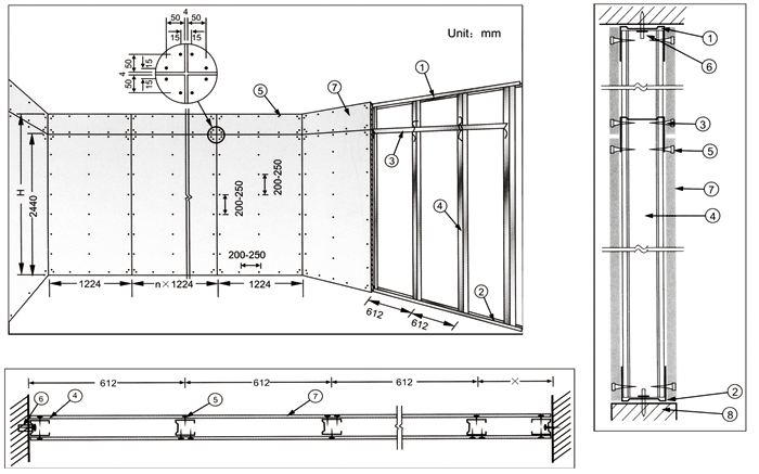 Mark the accurate location of ceiling keel 、floor keel 、door & window、sanitary fixture and pipes according to design drawing. The vertical keels should be arranged in turn in the same direction and make sure them upright, the distance between centers is 400mm~600mm.